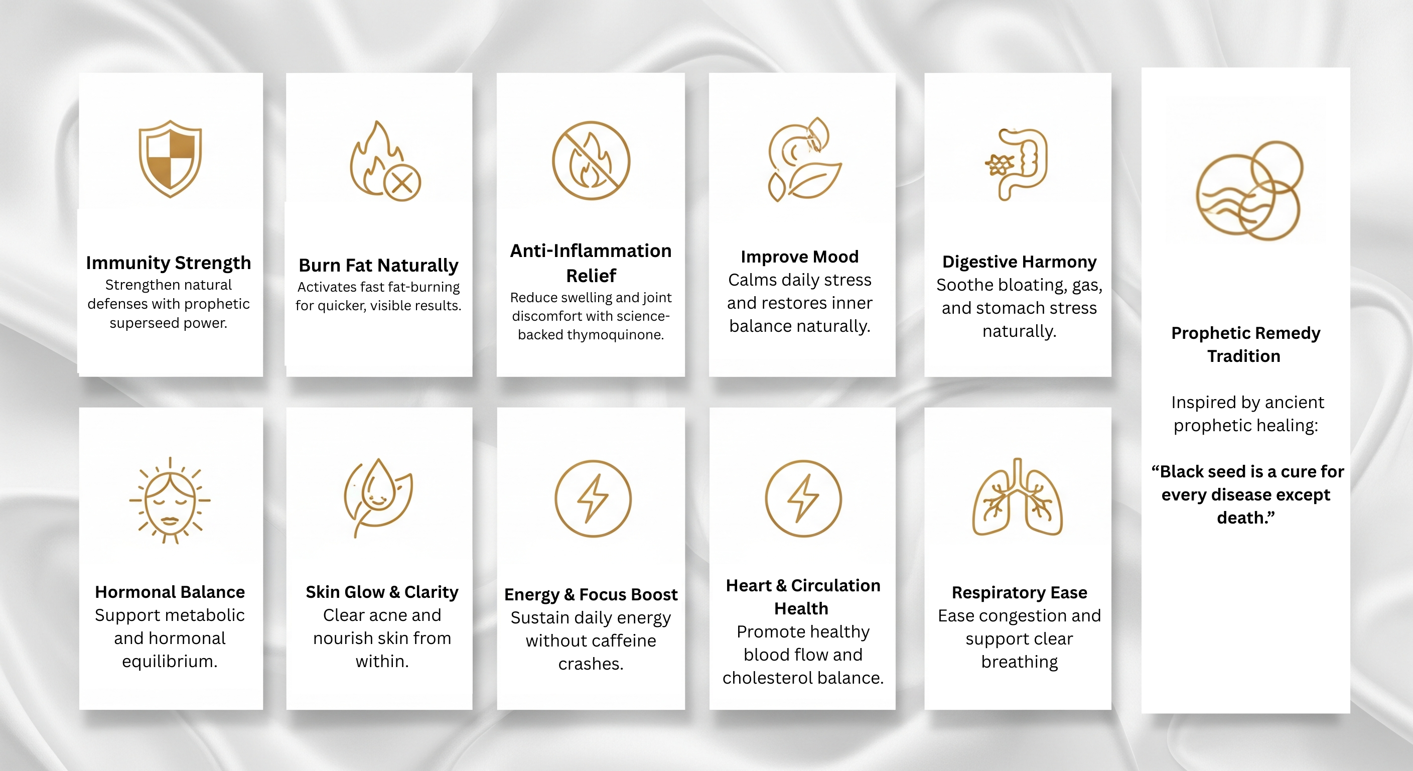 Our Black Seed formulation is inspired by the well-known Prophetic tradition: “Black seed is a healing for every type of disease except death.” — A timeless reminder of its holistic healing benefits.